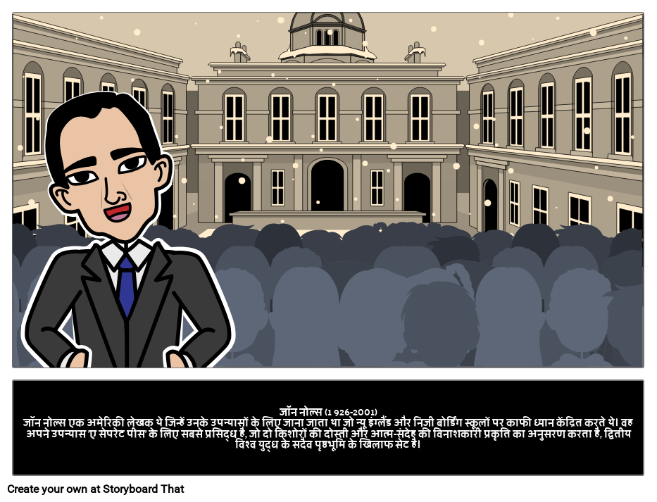 जॉन नोल्स (1 926-2001)जॉन नोल्स एक अमेरिकी लेखक थे जिन्हें उनके उपन्यासों के लिए जाना जाता था जो न्यू इंग्लैंड और निजी बोर्डिंग स्कूलों पर काफी ध्यान केंद्रित करते थे। वह अपने उपन्यास 'ए सेपरेट पीस' के लिए सबसे प्रसिद्ध है, जो दो किशोरों की दोस्ती और आत्म-संदेह की विनाशकारी प्रकृति का अनुसरण करता है, द्वितीय विश्व युद्ध के सदैव पृष्ठभूमि के खिलाफ सेट है।