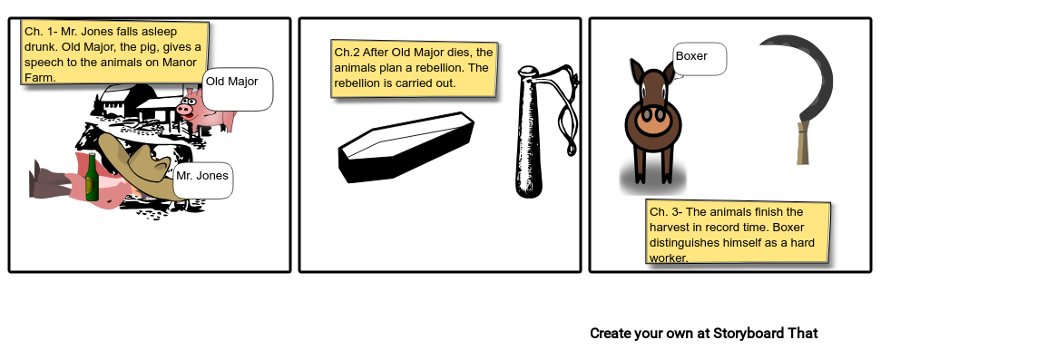 Storyboard example of what part of a ch.1 through 6 summary of "Animal Farm" should look like.