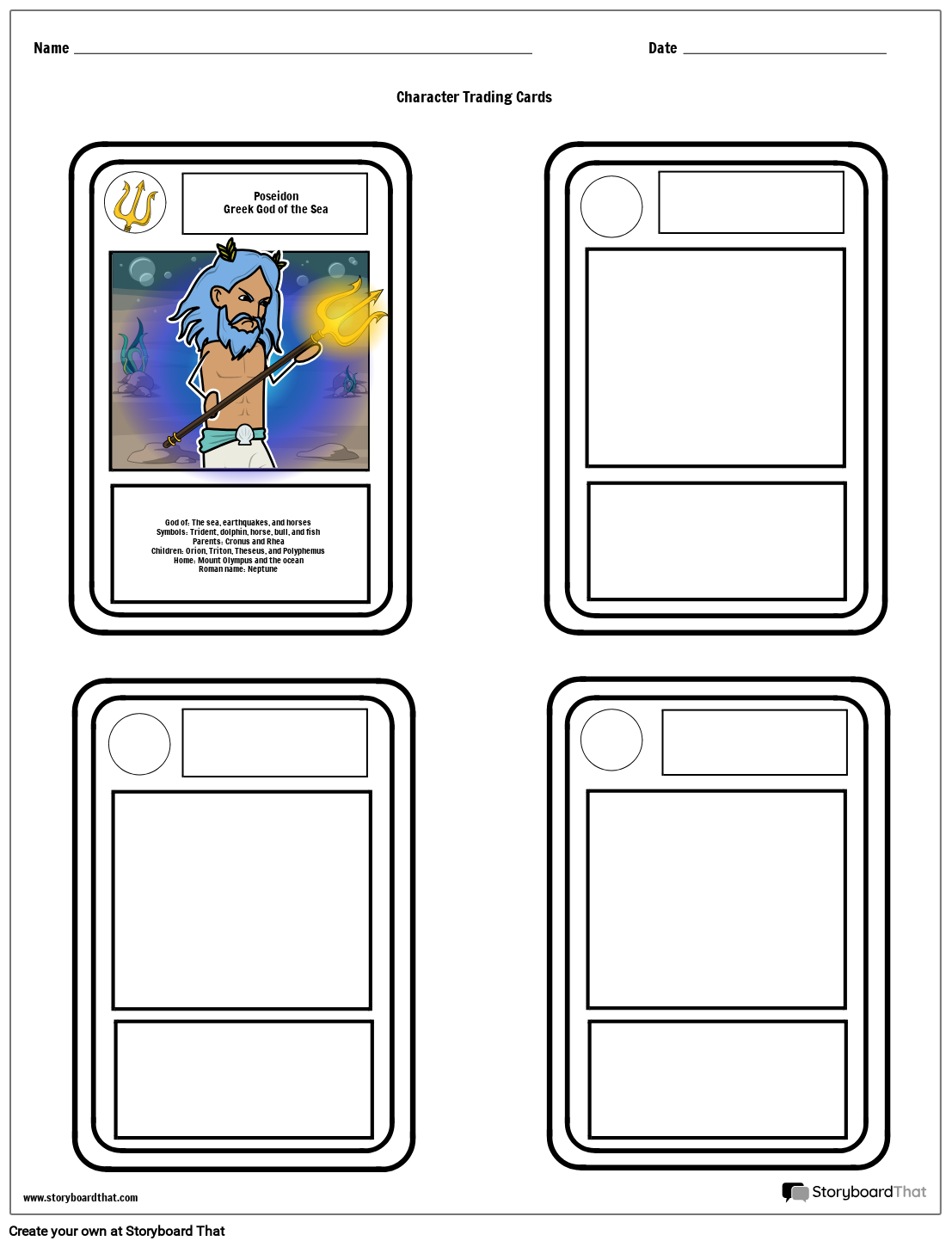 • God of: The sea, earthquakes, and horsesSymbols: Trident, dolphin, horse, bull, and fishParents: Cronus and RheaChildren: Orion, Triton, Theseus, and PolyphemusHome: Mount Olympus and the oceanRoman name: Neptune