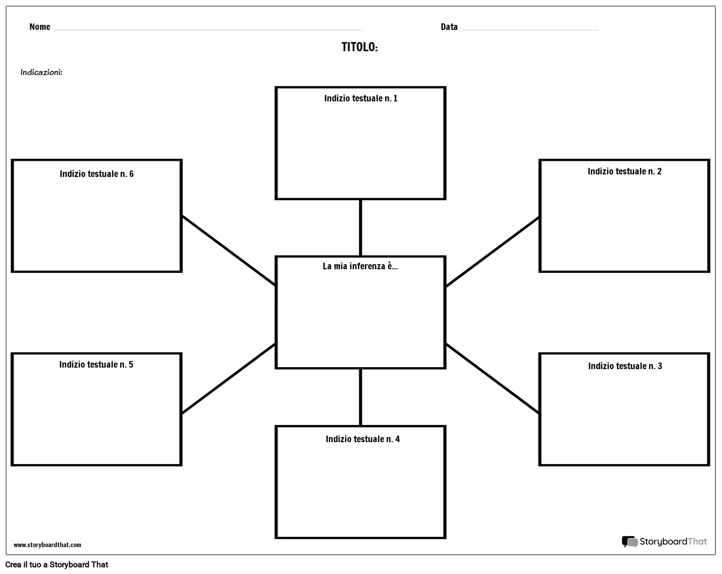 Organizzatore grafico di mappe ragno per mappare inferenze e indizi testuali. Spazio per 6 indizi! Bianco e nero per una facile stampa.
