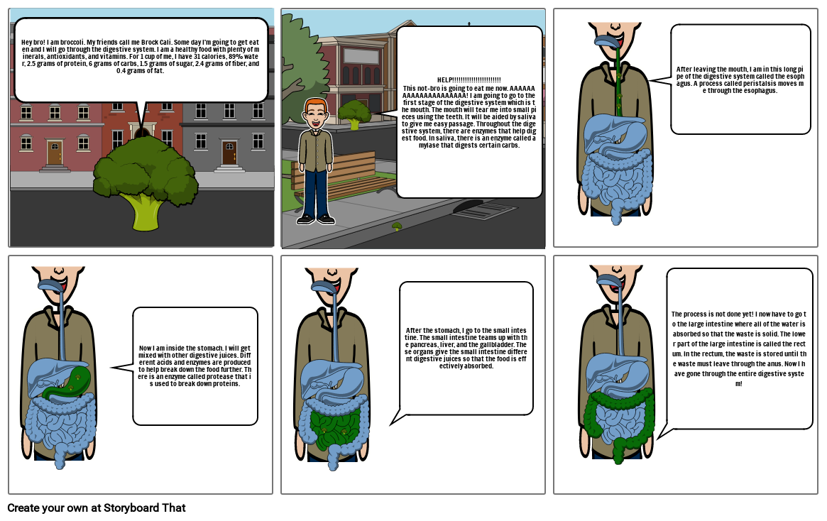 Hey bro! I am broccoli. My friends call me Brock Cali. Some day I'm going to get eaten and I will go through the digestive system. I am a healthy food with plenty of minerals, antioxidants, and vitamins. For 1 cup of me, I have 31 calories, 89% water, 2.5 grams of protein, 6 grams of carbs, 1.5 grams of sugar, 2.4 grams of fiber, and 0.4 grams of fat.