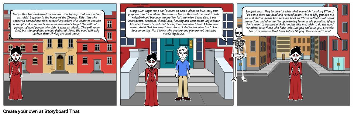 Mary Ellen has been dead for the last thurty days. But she revived but didn´t appear in the house of the Zinman. This time she appeared somewhere else, somewhere where she wants to act like a vampire. A vampire is someone who wants to get the evil out of people, of good people who didn´t wish as wisely. The evil never died, but the good has always defeated them, the good will only defeat them if they are with Jesus.