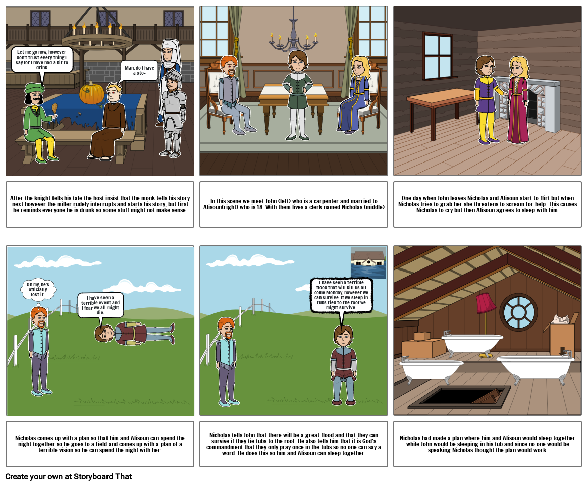 Nicholas tells John that there will be a great flood and that they can survive if they tie tubs to the roof. He also tells him that it is God's commandment that they only pray once in the tubs so no one can say a word. He does this so him and Alisoun can sleep together.