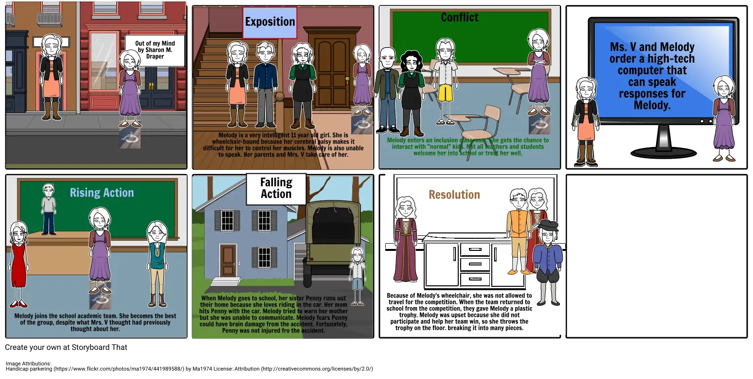 Melody is a very intelligent 11 year old girl. She is wheelchair-bound because her cerebral palsy makes it difficult for her to control her muscles. Melody is also unable to speak. Her parents and Mrs. V take care of her.