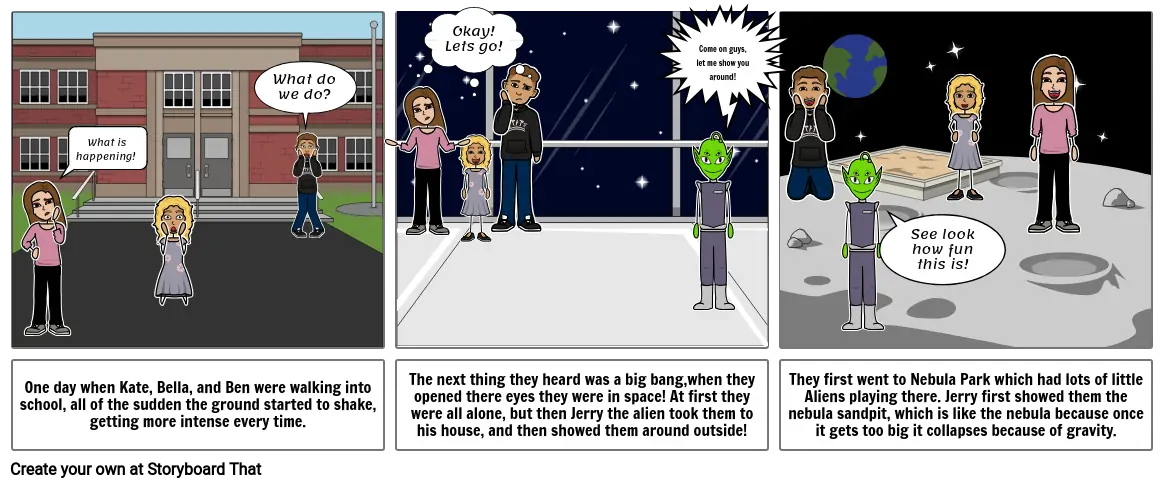 The next thing they heard was a big bang,when they opened there eyes they were in space! At first they were all alone, but then Jerry the alien took them to his house, and then showed them around outside!