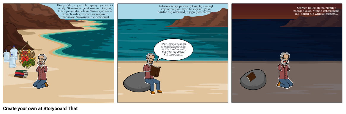 Kiedy łódź przywiozła zapasy żywności i wody, Skawiński ujrzał również książki, które przysłało polskie Towarzystwo w ramach wdzięczności za wsparcie finansowe. Skawiński nie dowierzał.