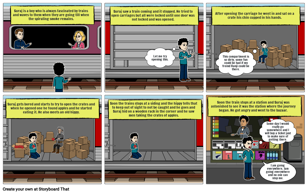 Soon the trains stops at a siding and the hippy tells that to keep out of sight to not be caught and he goes and Suraj hid on a wooden rack in the corner and he saw men taking the crates of apples.