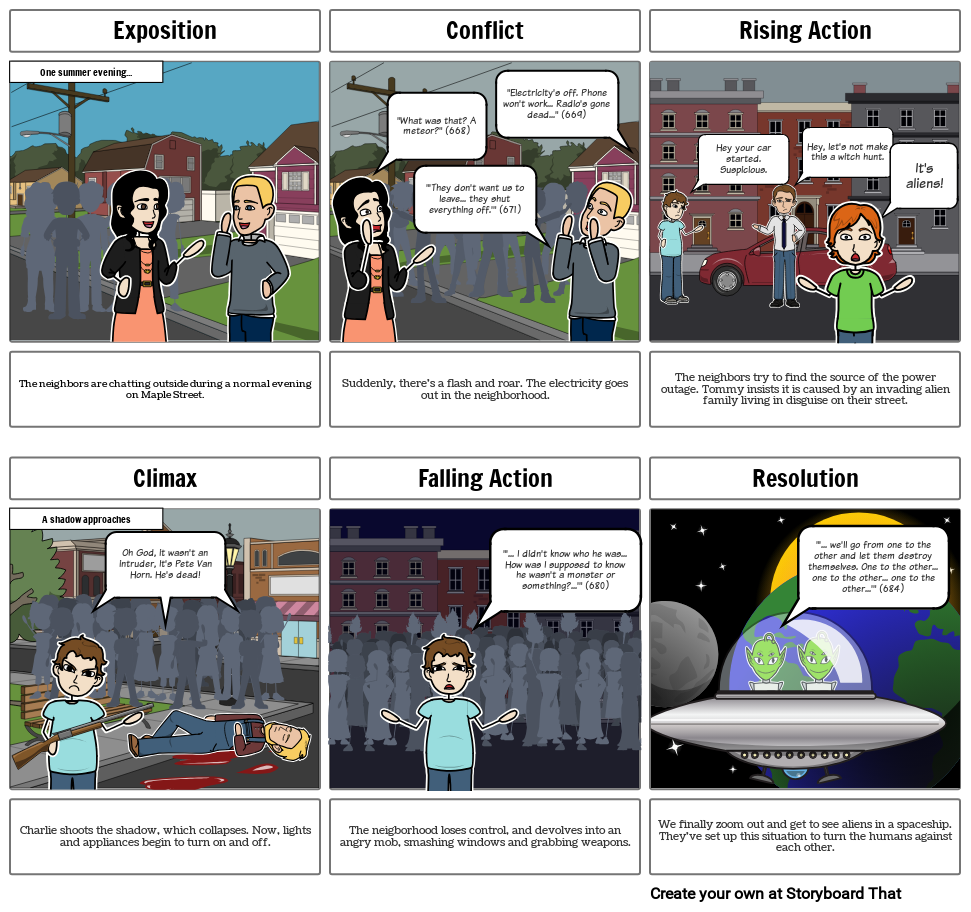 This is a sample "plot map" of the famous Twilight Zone story, The Monsters are due on Maple Street by Rod Sterling. This is an example of how one could teach the parts of a narrative with storyboards!