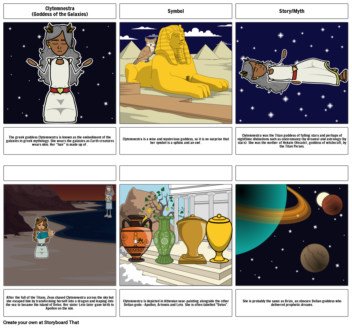 Clytemnestra was the Titan goddess of falling stars and perhaps of nighttime divinations such as oneiromancy (by dreams) and astrology (by stars). She was the mother of Hekate (Hecate), goddess of witchcraft, by the Titan Perses.