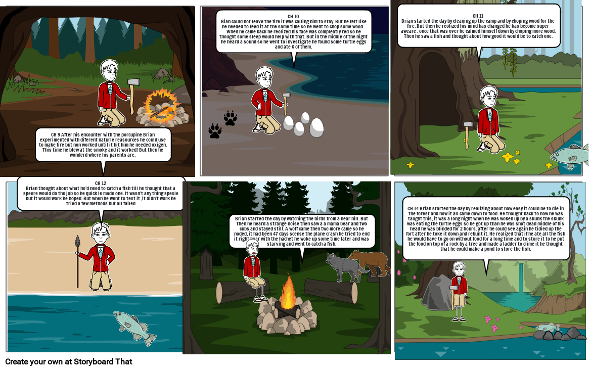 CH 14 Brian started the day by realizing about how easy it could be to die in the forest and how it all came down to food. He thought back to how he was taught this, it was a long night when he was woken up by a skunk the skunk was eating the turtle eggs so he got up than he was shot dead middle of his head he was blinded for 2 hours. after he could see again he tidied up the fort after he toke it down and rebuilt it. He realized that if he ate all the fish he would have to go on without food for a long time and to store it to he put the food on top of a rock by a tree and made a ladder to clime it he thought that he could make a pond to store the fish.
