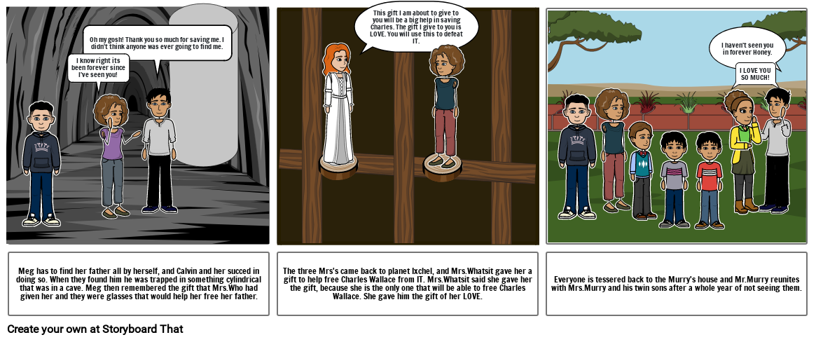 Meg has to find her father all by herself, and Calvin and her succed in doing so. When they found him he was trapped in something cylindrical that was in a cave. Meg then remembered the gift that Mrs.Who had given her and they were glasses that would help her free her father.
