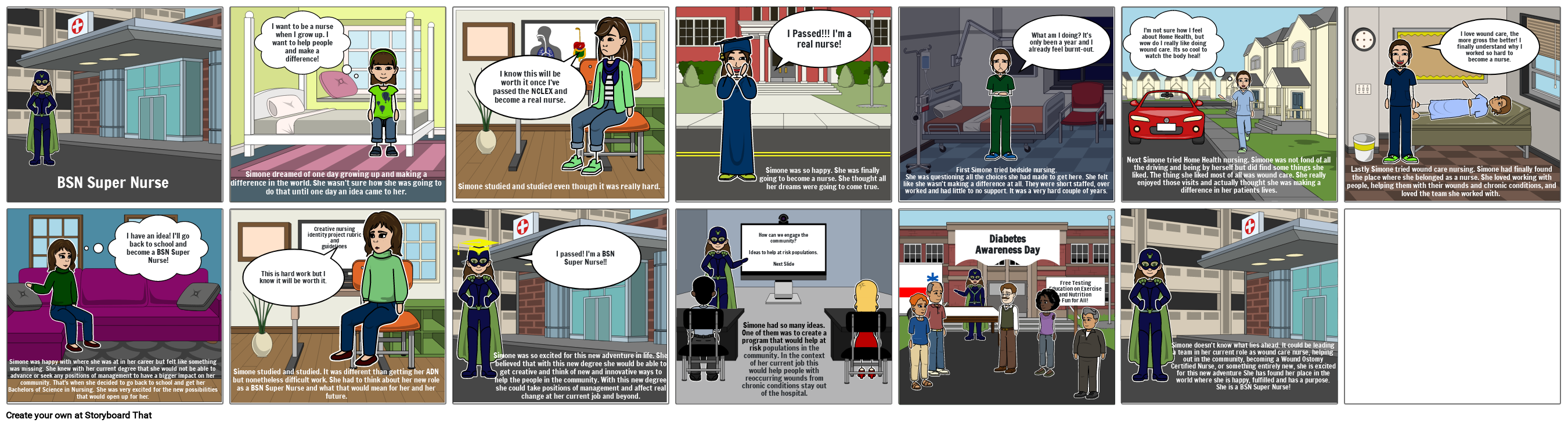 Simone studied and studied. It was different than getting her ADN but nonetheless difficult work. She had to think about her new role as a BSN Super Nurse and what that would mean for her and her future.