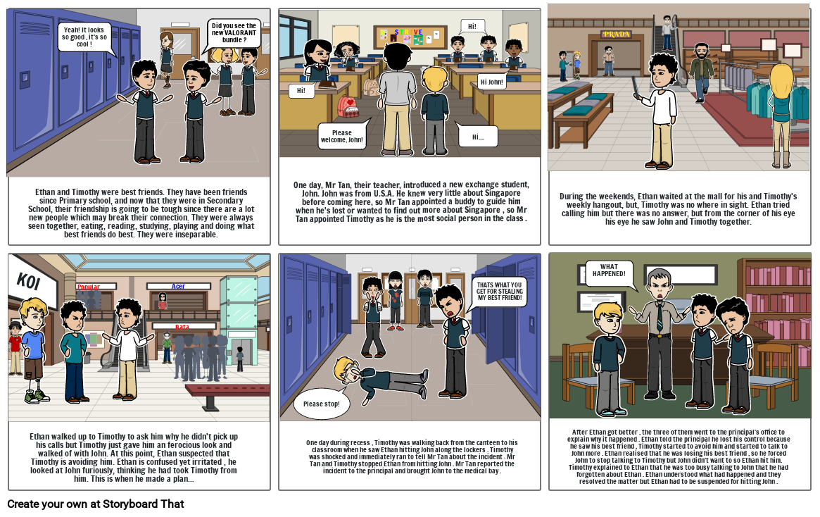 After Ethan got better , the three of them went to the principal's office to explain why it happened . Ethan told the principal he lost his control because he saw his best friend , Timothy started to avoid him and started to talk to John more . Ethan realised that he was losing his best friend , so he forced John to stop talking to Timothy but John didn't want to so Ethan hit him. Timothy explained to Ethan that he was too busy talking to John that he had forgotten about Ethan . Ethan understood what had happened and they resolved the matter but Ethan had to be suspended for hitting John .