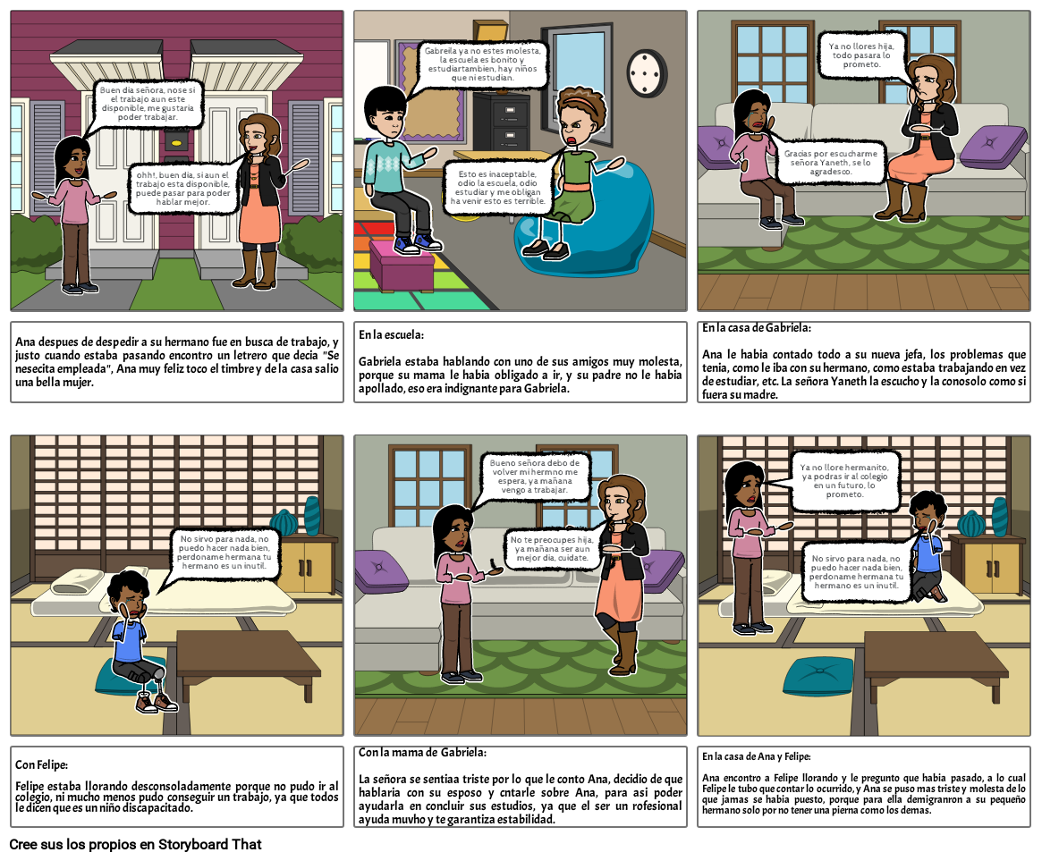 Con la mama de  Gabriela:La señora se sentiaa triste por lo que le conto Ana, decidio de que hablaria con su esposo y cntarle sobre Ana, para asi poder ayudarla en concluir sus estudios, ya que el ser un rofesional ayuda muvho y te garantiza estabilidad.