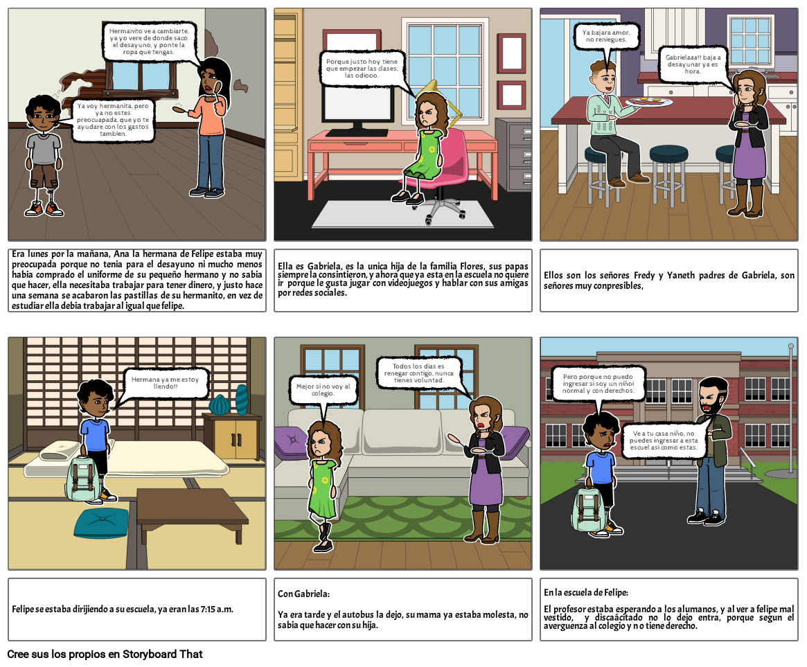 Era lunes por la mañana, Ana la hermana de Felipe estaba muy preocupada porque no tenia para el desayuno ni mucho menos habia comprado el uniforme de su pequeño hermano y no sabia que hacer, ella necesitaba trabajar para tener dinero, y justo hace una semana se acabaron las pastillas de su hermanito, en vez de estudiar ella debia trabajar al igual que felipe.