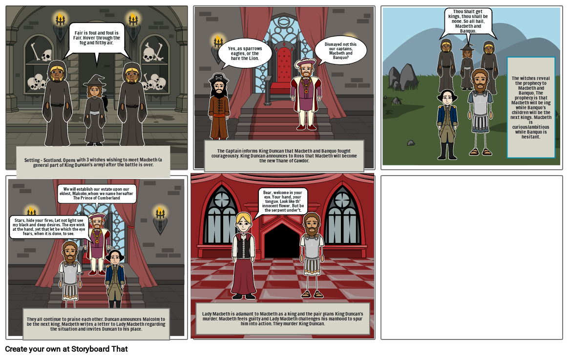 The witches reveal the prophecy to Macbeth and Banquo. The prophecy is that Macbeth will be ing while Banquo's children will be the next kings. Macbeth is curious/ambitious while Banquo is hesitant.