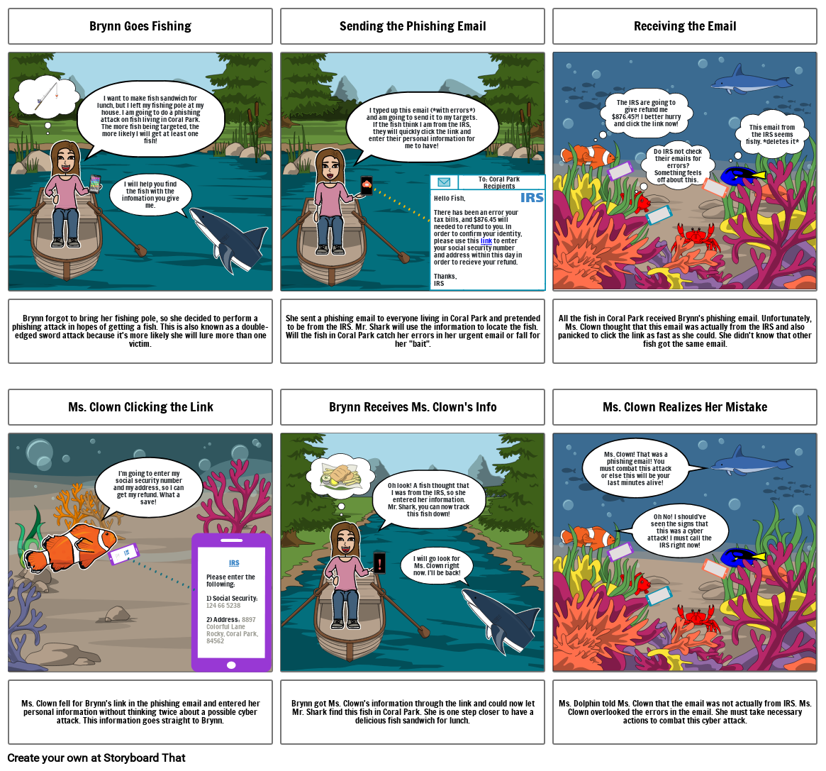All the fish in Coral Park received Brynn's phishing email. Unfortunately, Ms. Clown thought that this email was actually from the IRS and also panicked to click the link as fast as she could. She didn't know that other fish got the same email.