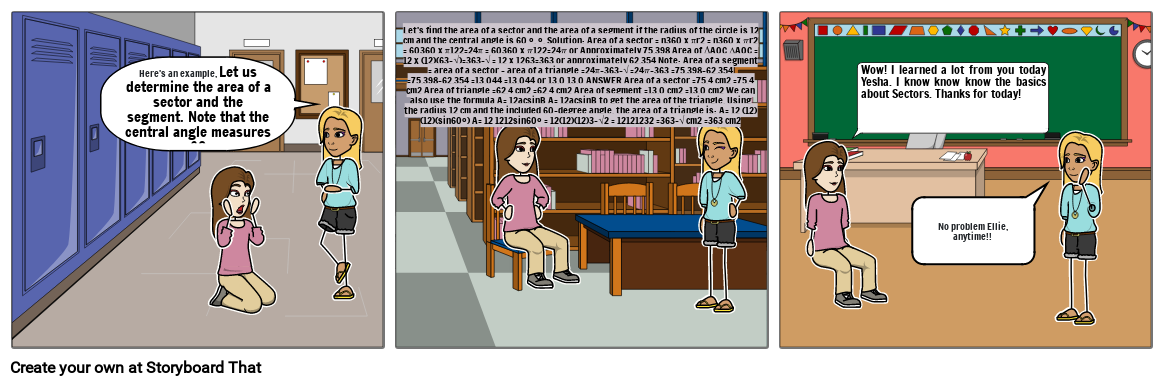 Let's find the area of a sector and the area of a segment if the radius of the circle is 12 cm and the central angle is 60 °. °. Solution: Area of a sector = n360 x πr2 = n360 x 𝜋r2 = 60360 x π122=24π = 60360 x 𝜋122=24𝜋 or Approximately 75.398 Area of ΔAOC ∆AOC = 12 x (12)(63–√)=363–√ = 12 x 1263=363 or approximately 62.354 Note: Area of a segment = area of a sector – area of a triangle =24π−363–√ =24𝜋−363 =75.398−62.354 =75.398−62.354 =13.044 =13.044 or 13.0 13.0 ANSWER Area of a sector =75.4 cm2 =75.4 cm2 Area of triangle =62.4 cm2 =62.4 cm2 Area of segment =13.0 cm2 =13.0 cm2 We can also use the formula A= 12acsinB A= 12acsinB to get the area of the triangle. Using the radius 12 cm and the included 60-degree angle, the area of a triangle is: A= 12 (12)(12)(sin60°) A= 12 1212sin60° = 12(12)(12)3–√2 = 12121232 =363–√ cm2 =363 cm2