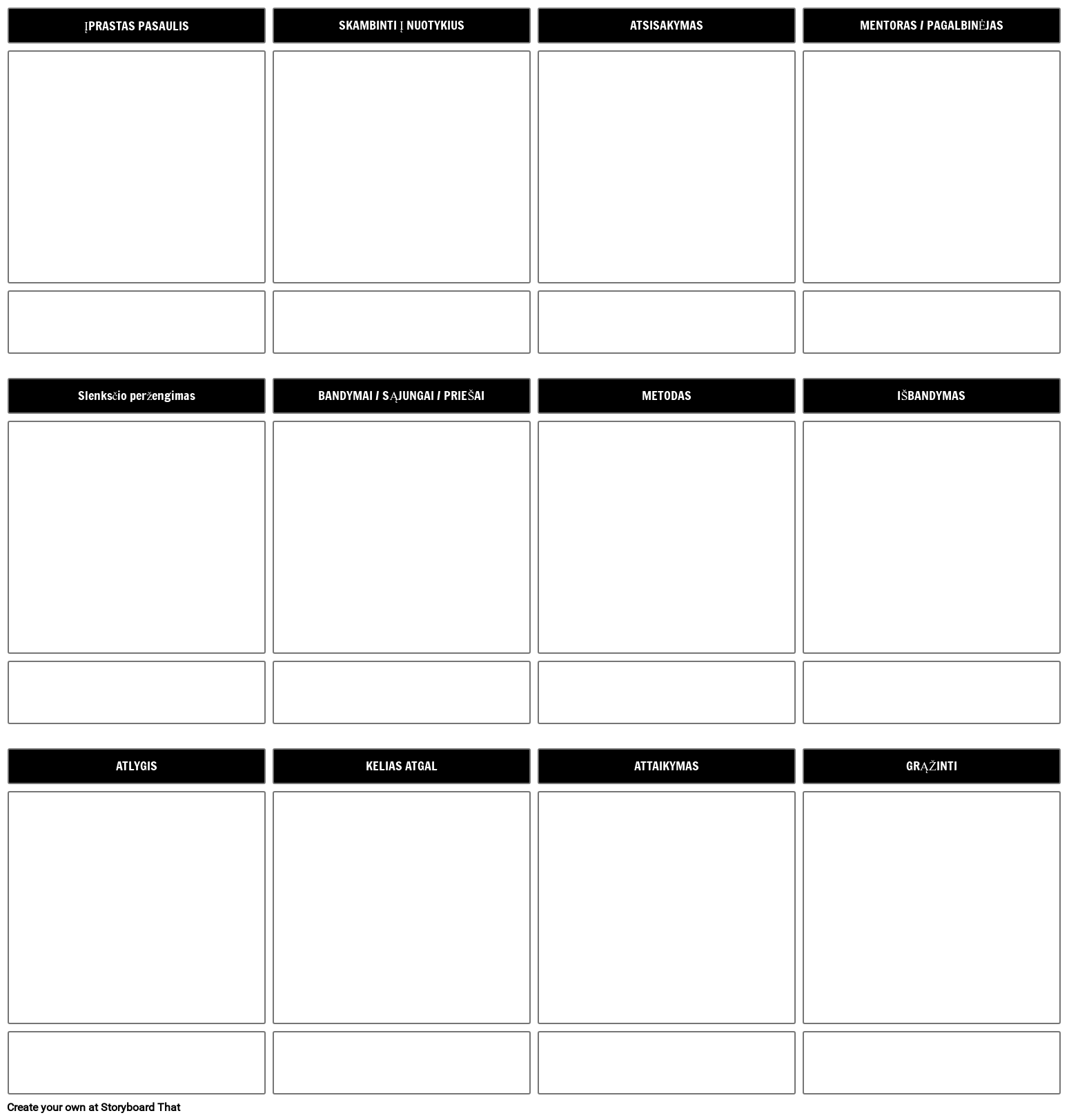 Herojaus kelionės šablonas | Paprašykite mokinių skaitomoje knygoje nustatyti herojaus kelionės etapus. Jie gali naudoti Storyboard That meno kūrinius arba įkelti savo vaizdus