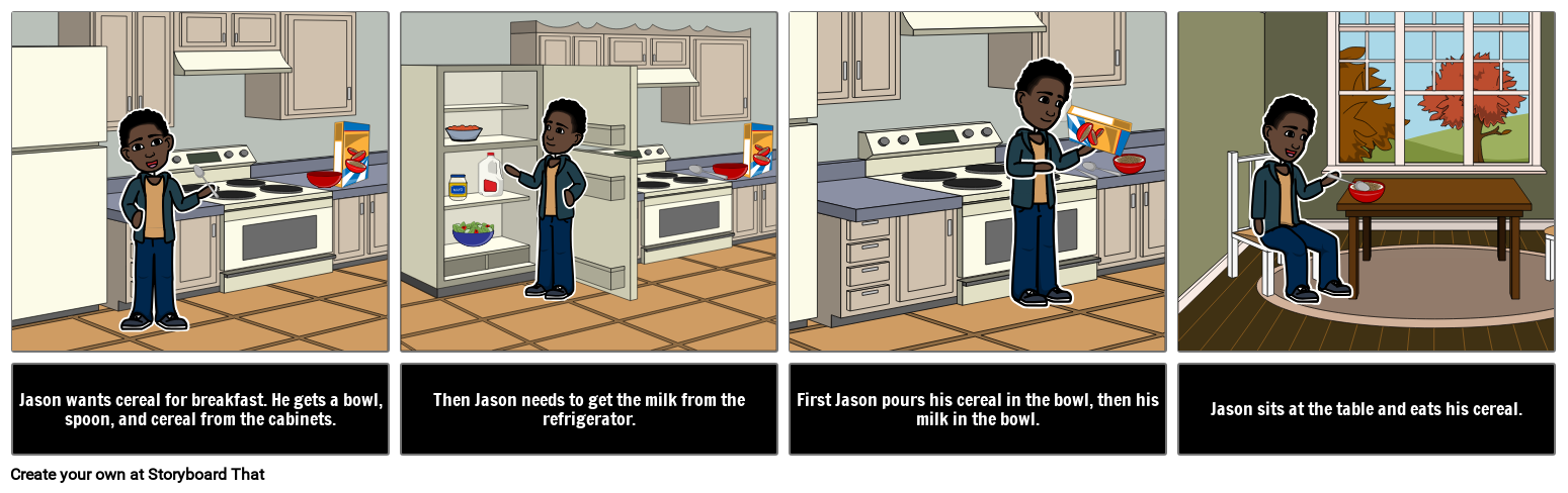 First Jason pours his cereal in the bowl, then his milk in the bowl.