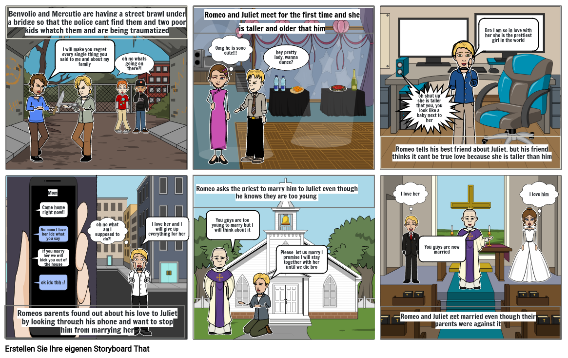 Romeo and Juliet meet for the first time and she is taller and older that him