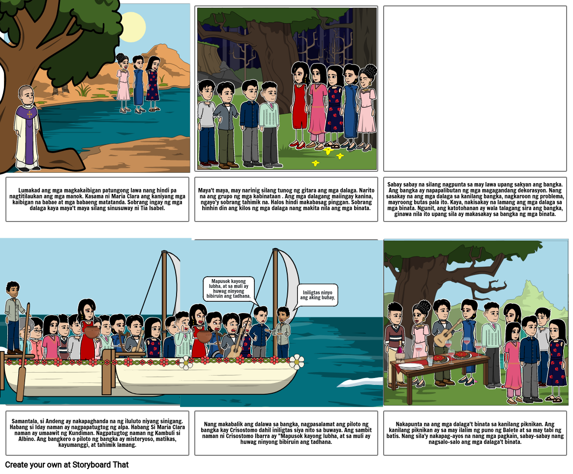 Samantala, si Andeng ay nakapaghanda na ng iluluto niyang sinigang. Habang si Iday naman ay nagpapatugtog ng alpa. Habang Si Maria Clara naman ay umaawit ng Kundiman. Nagpatugtog naman ng Kambuli si Albino. Ang bangkero o piloto ng bangka ay misteryoso, matikas, kayumanggi, at tahimik lamang.