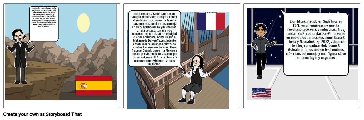 Hola desde La Salle. Tam fue un famoso explorador francés. Exploré el río Misisipi, convencí a Francia para que estableciera una colonia en su desembocadura y mucho más. Un día de 1685, con mis 400 hombres, me dirigía al río Misisipi cuando accidentalmente llegué a Matagorda Day en Texas. Intenté establecer relaciones amistosas con los karankawas locales. Pero fracasé. Cuando quise ir a México a buscar provisiones, fui atacado por los karankawas. Al final, solo siete hombres sobrevivieron, y todos murieron.