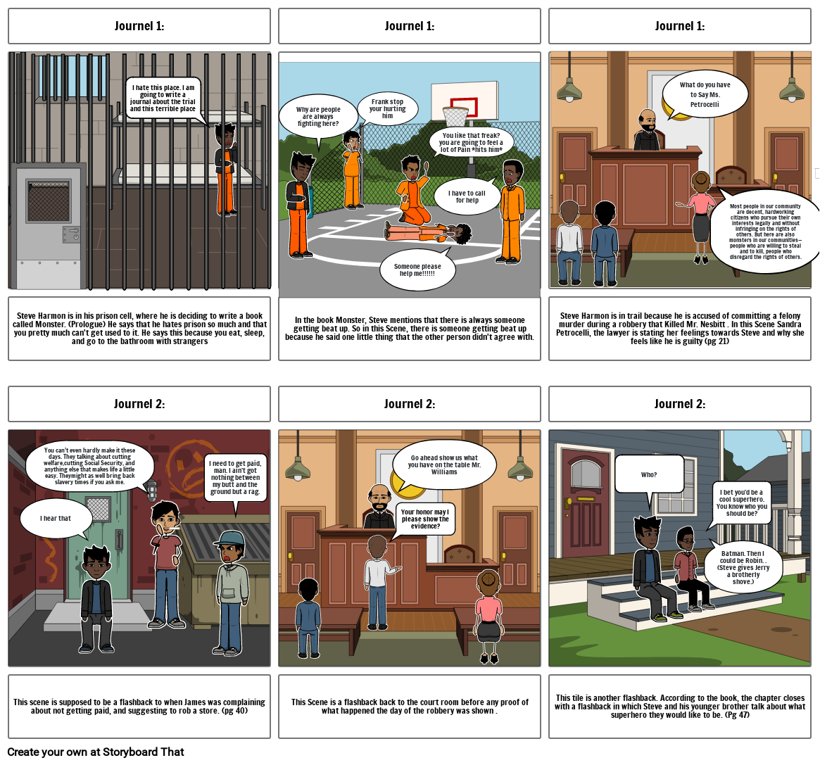 Steve Harmon is in his prison cell, where he is deciding to write a book called Monster. (Prologue) He says that he hates prison so much and that you pretty much can't get used to it. He says this because you eat, sleep, and go to the bathroom with strangers