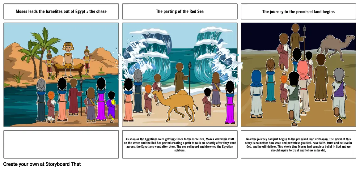 Now the journey had just begun to the promised land of Caanan. The moral of this story is no matter how weak and powerless you feel, have faith, trust and believe in God, and he will deliver. This whole time Moses had complete belief in God and we should aspire to trust and follow as he did.