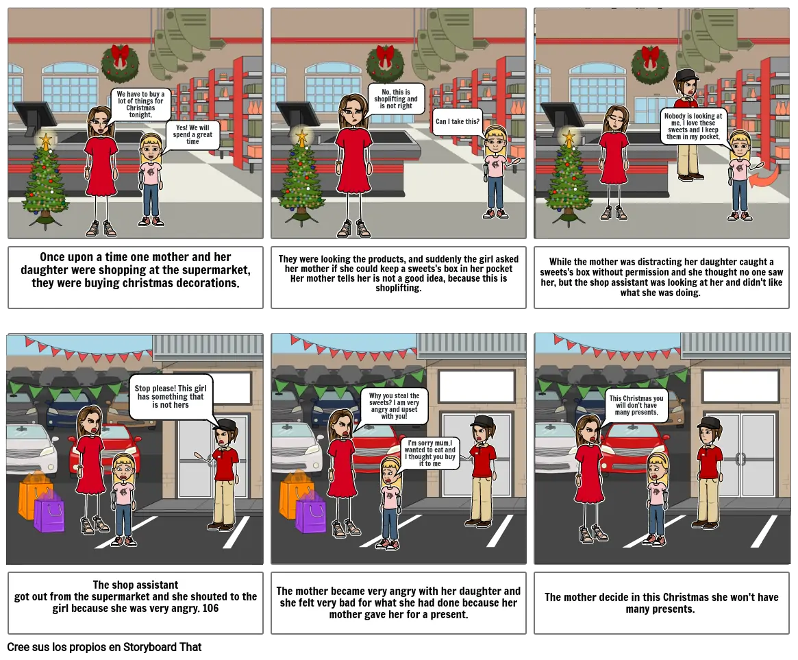 They were looking the products, and suddenly the girl askedher mother if she could keep a sweets's box in her pocketHer mother tells her is not a good idea, because this is shoplifting.