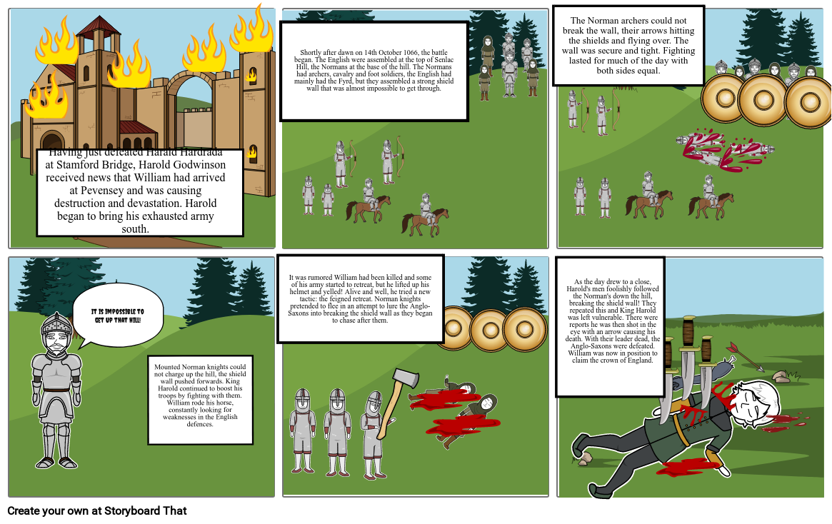 As the day drew to a close, Harold's men foolishly followed the Norman's down the hill, breaking the shield wall! They repeated this and King Harold was left vulnerable. There were reports he was then shot in the eye with an arrow causing his death. With their leader dead, the Anglo-Saxons were defeated. William was now in position to claim the crown of England.