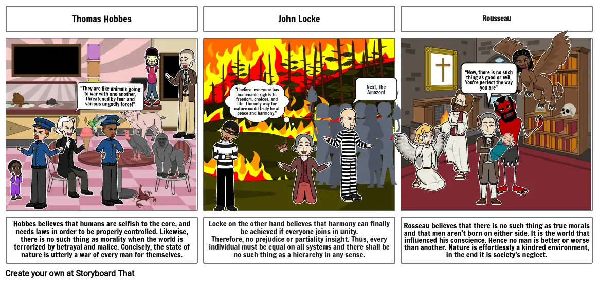 Hobbes believes that humans are selfish to the core, and needs laws in order to be properly controlled. Likewise, there is no such thing as morality when the world is terrorized by betrayal and malice. Concisely, the state of nature is utterly a war of every man for themselves.