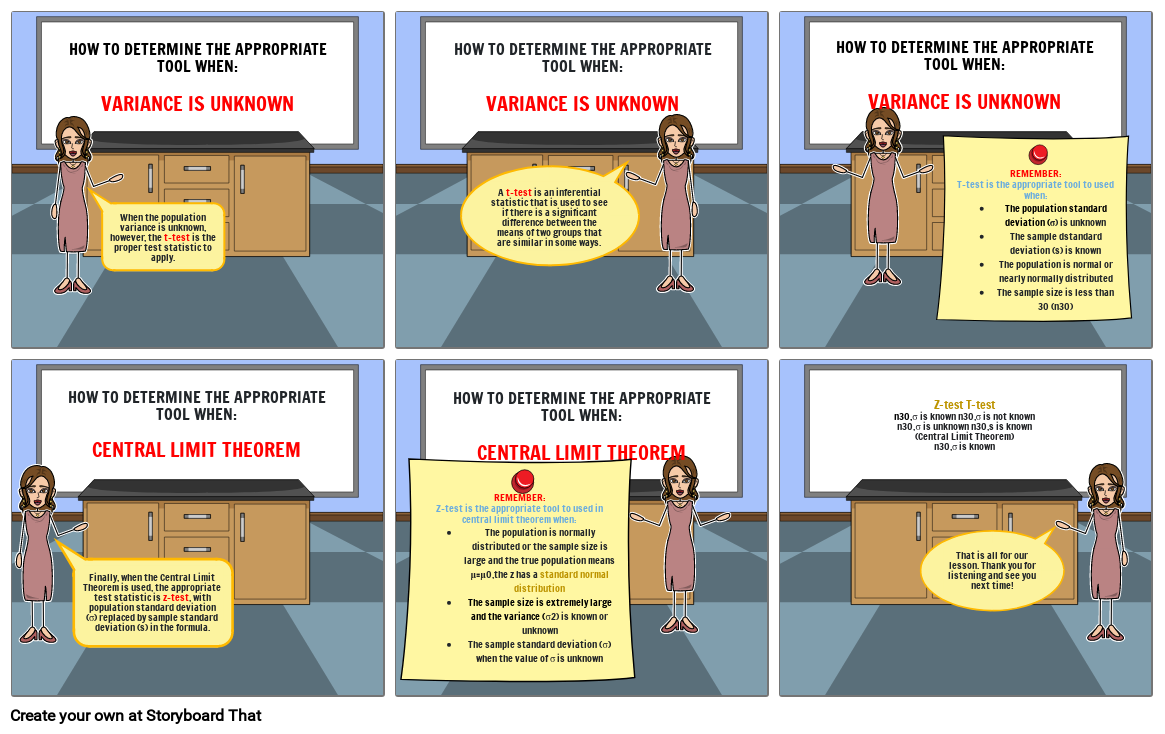 REMEMBER: Z-test is the appropriate tool to used in central limit theorem when:The population is normally distributed or the sample size is large and the true population means μ=μ0,the z has a standard normal distributionThe sample size is extremely large and the variance (σ2) is known or unknownThe sample standard deviation (σ) when the value of σ is unknown