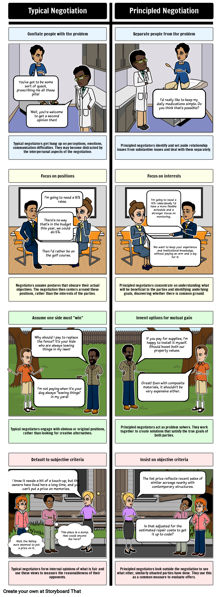 Typical vs. Principled Negotiations: Contrasting the typical approach to negotiations with the principled approach proposed in Getting to Yes.