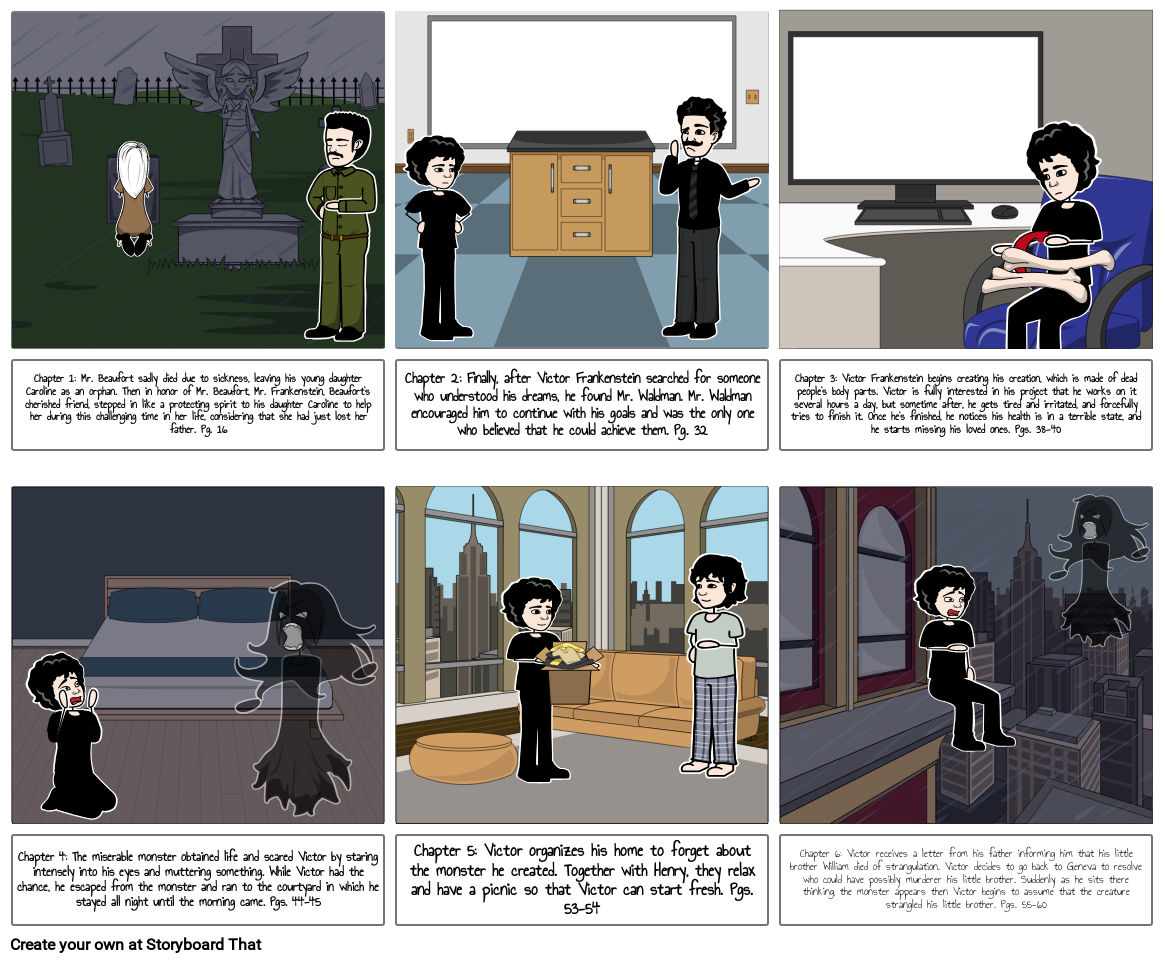 Chapter 3: Victor Frankenstein begins creating his creation, which is made of dead people's body parts. Victor is fully interested in his project that he works on it several hours a day, but sometime after, he gets tired and irritated, and forcefully tries to finish it. Once he's finished, he notices his health is in a terrible state, and he starts missing his loved ones. Pgs. 38-40