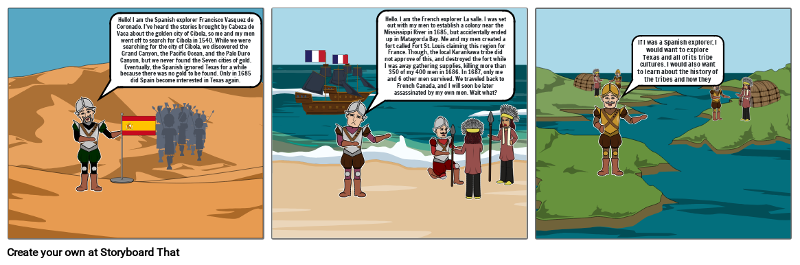 Hello! I am the Spanish explorer Francisco Vasquez de Coronado. I've heard the stories brought by Cabeza de Vaca about the golden city of Cibola, so me and my men went off to search for Cibola in 1540. While we were searching for the city of Cibola, we discovered the Grand Canyon, the Pacific Ocean, and the Palo Duro Canyon, but we never found the Seven cities of gold. Eventually, the Spanish ignored Texas for a while because there was no gold to be found. Only in 1685 did Spain become interested in Texas again.
