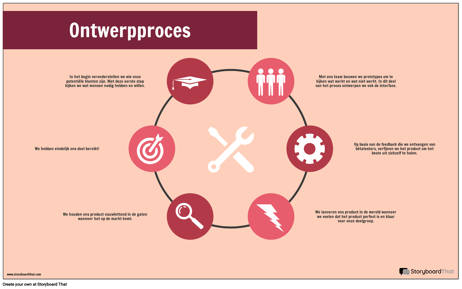In het begin veronderstellen we wie onze potentiële klanten zijn. Met deze eerste stap kijken we wat mensen nodig hebben en willen. We hebben eindelijk ons doel bereikt! We houden ons product nauwlettend in de gaten wanneer het op de markt komt. Met ons team bouwen we prototypes om te kijken wat werkt en wat niet werkt. In dit deel van het proces ontwerpen we ook de interface. Op basis van de feedback die we ontvangen van bètatesters, verfijnen we het product om het beste uit zichzelf te halen. We lanceren ons product in de wereld wanneer we voelen dat het product perfect is en klaar voor onze doelgroep.