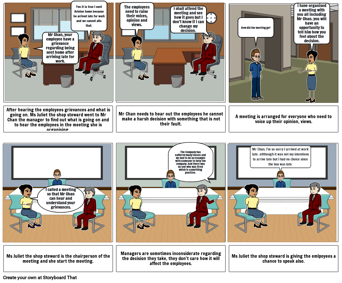 After hearing the employees grievances and what is going on. Ms Juliet the shop steward went to Mr Chan the manager to find out what is going on and to hear the employees in the meeting she is organising.