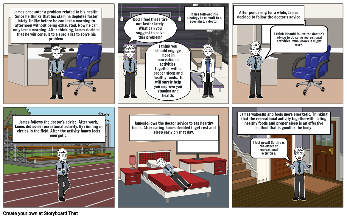 James encounter a problem related to his health. Since he thinks that his stamina depletes faster lately. Unlike before he can last a morning to afternoon without being exhausted. Now he can only last a morning. After thinking, James decided that he will consult to a specialist to solve his problem.