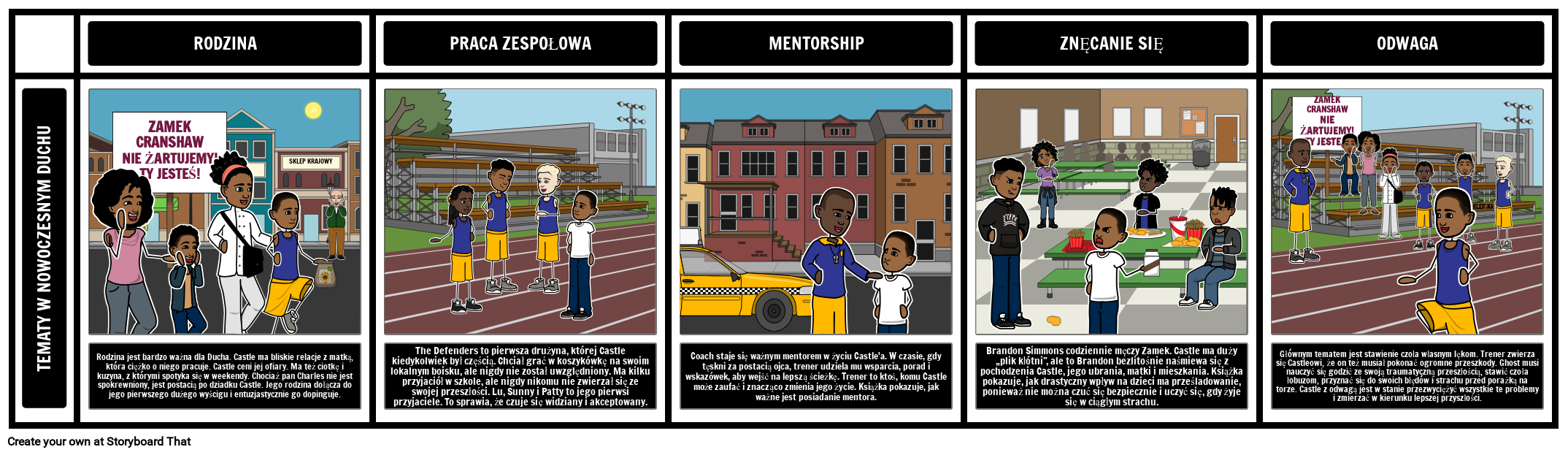 W powieści Ghost jest wiele tematów: rodzina, praca zespołowa, mentoring, zastraszanie, odwaga, tożsamość, pamięć i przeszłość, zespół stresu pourazowego, łamanie prawa i sprawiedliwość, przemoc w rodzinie, ubóstwo. Uczniowie mogą zgłębiać temat w powieści, identyfikując temat lub otrzymując temat do śledzenia podczas czytania. Następnie uczniowie mogą utworzyć scenorys ilustrujący przykłady tego tematu z tekstu.
