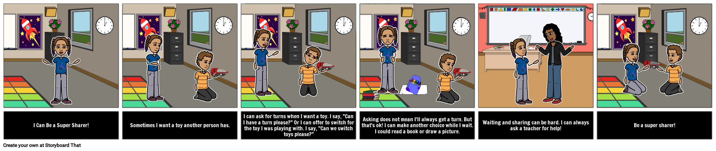 I can ask for turns when I want a toy. I say, "Can I have a turn please?" Or I can offer to switch for the toy I was playing with. I say, "Can we switch toys please?"