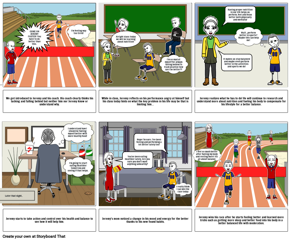 Jeremy wins his race after he starts feeling better and learned more tricks such as getting more sleep and better food into his body in a better balanced life with moderation.