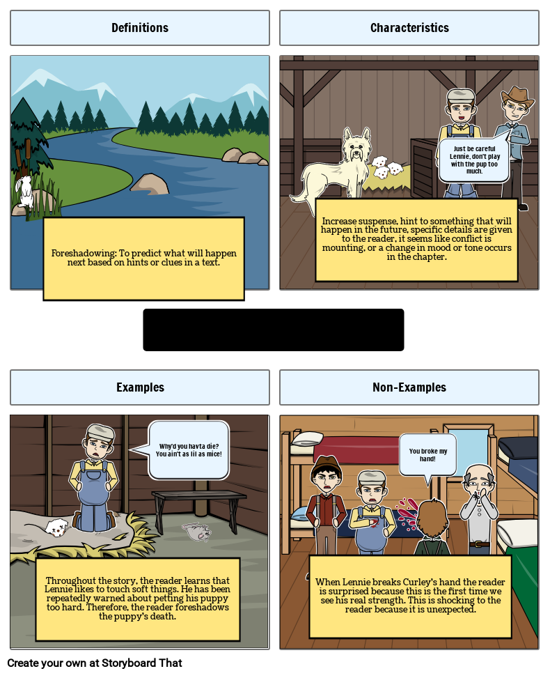 Throughout the story, the reader learns that Lennie likes to touch soft things. He has been repeatedly warned about petting his puppy too hard. Therefore, the reader foreshadows the puppy's death.