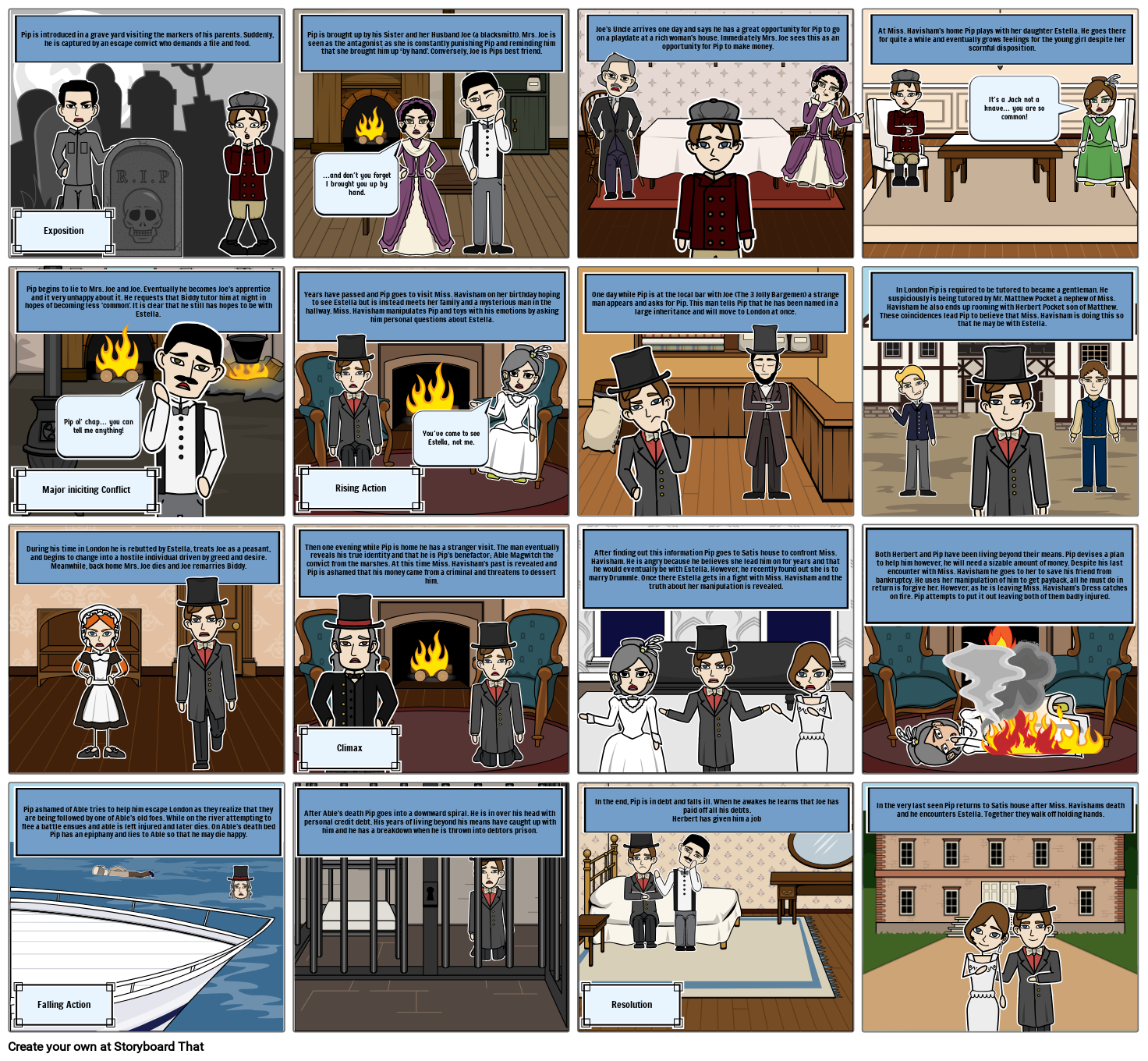 Pip ashamed of Able tries to help him escape London as they realize that they are being followed by one of Able’s old foes. While on the river attempting to flee a battle ensues and able is left injured and later dies. On Able’s death bed Pip has an epiphany and lies to Able so that he may die happy.