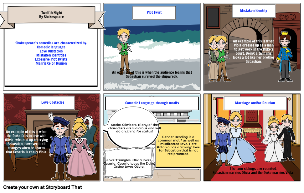 Shakespeare's comedies are characterized by: Comedic languageLove ObstaclesMistaken IdentitiesExcessive Plot TwistsMarriage or Runion