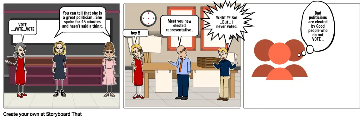 This comic represents the relationship between the politicians and the voters . The voters disliked the politician and decided not to vote . So due to their bad decision making of not voting ,they lost their right to complain . After the election results were declared , the same politician was in power . This comic describes how important voting is for the people to shape the government and the society . Everyone has a right to express their opinion in the government . and that is through their vote .