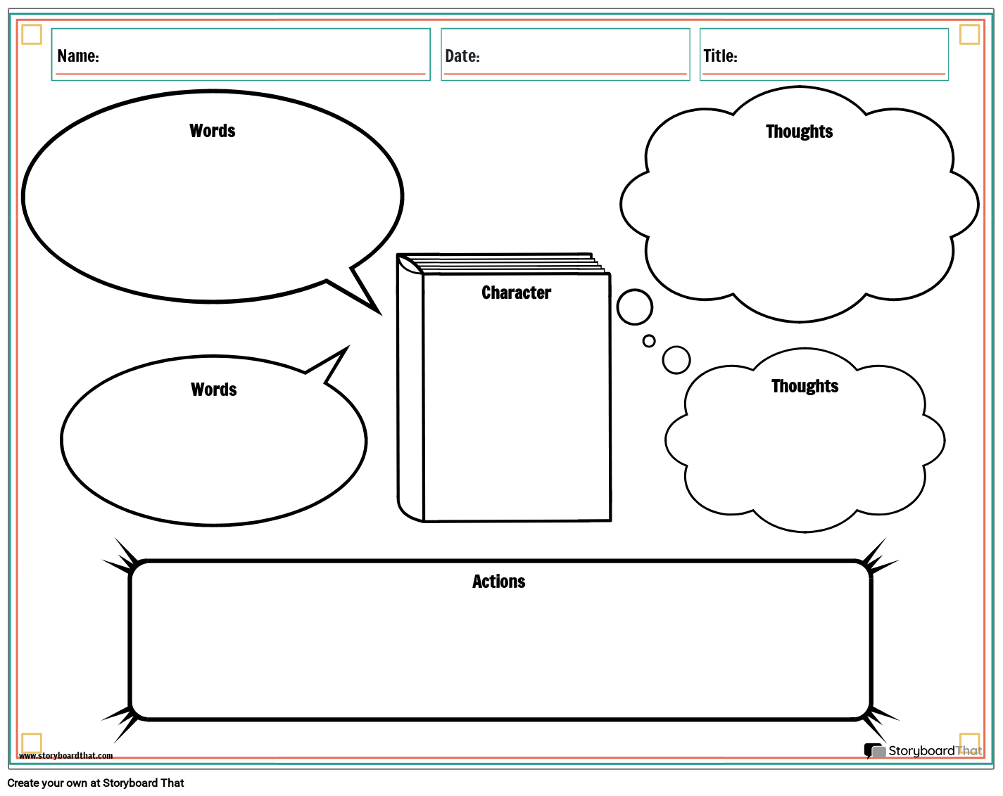 Foaie de lucru cu harta personajelor care poate fi folosită tipărită sau digitală, unde elevii pot desena sau adăuga personajul cărții în centru și spații pentru a descrie cuvintele, gândurile și acțiunile personajului.