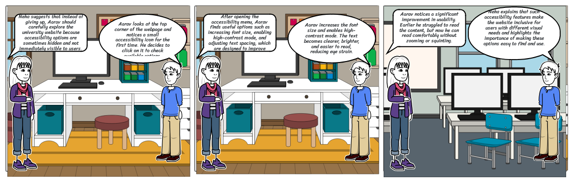 Neha explains that such accessibility features make the website inclusive for users with different visual needs and highlights the importance of making these options easy to find and use.