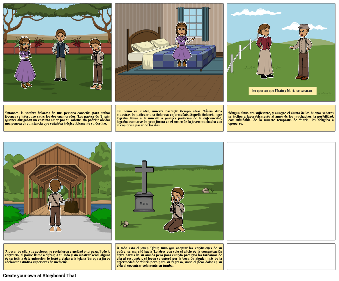 A todo esto el joven Efraín tuvo que aceptar las condiciones de su padre, se marchó hacia Londres con solo el alivio de la comunicación entre cartas de su amada pero para cuando presintió las tardanzas de ella al responder, el joven se enteró por la boca de alguien más de la enfermedad de María pero para su regreso, sintió el peor dolor en su vida al encontrar solamente su tumba.