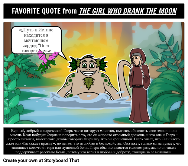 • Верный, добрый и лирический Глерк часто цитирует «поэта», пытаясь объяснить свои эмоции или мысли. Ксан побудил Фириана поверить в то, что он «просто огромный дракон», и что она и Глерк - просто гиганты, вместо того, чтобы говорить Фириану, что он крошечный. Глерк знает, что Ксан часто лжет или «искажает правду», но делает это из любви и беспокойства. Она лжет, только когда думает, что защищает кого-то от горя или душевной боли. Глерк обычно является голосом разума, но он также поддерживает рассказы Ксана, потому что верит в любовь и доброту, стоящие за ее мотивами.